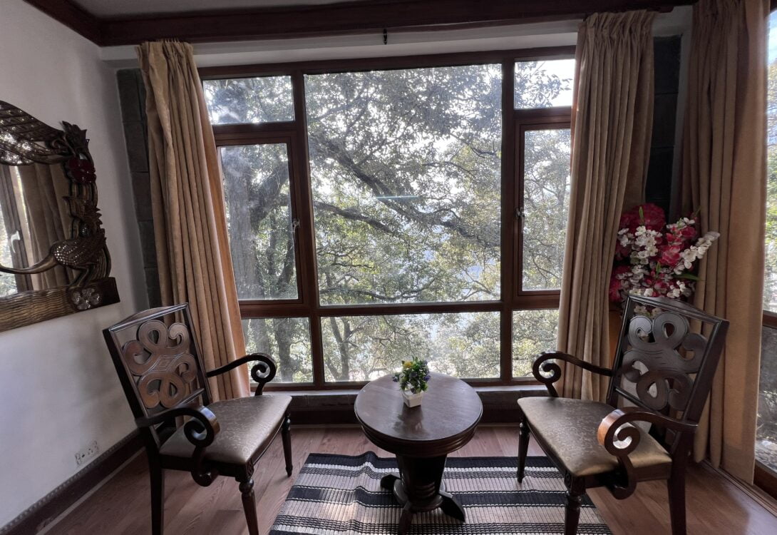 - Expansive living area with panoramic windows overlooking the scenic beauty.